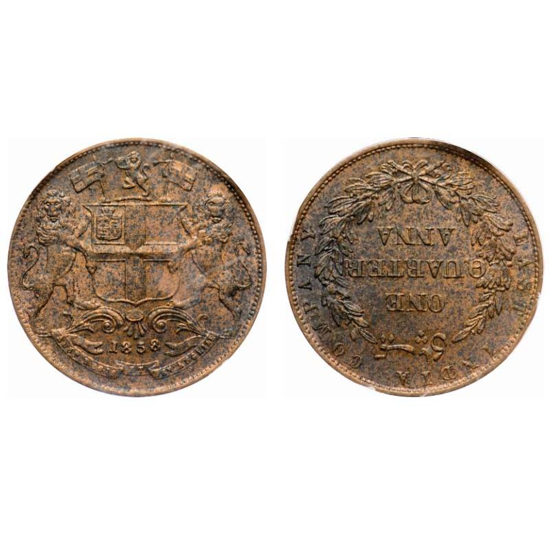 | Victoria Queen, Copper, Quarter Anna, 1858, J. Watt & Co., Birmingham Mint, Single leaf, Year numerals closer to the above 5 line design, Rev inverted. F. Prid # 156. GK 231. NGS Slabbed MS 62. Rare. |