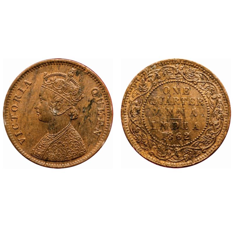 Victoria Queen, Copper, Quarter Anna, 1862, Madras Mint, A/I, No mint mark, No privy mark. F. Prid ...
