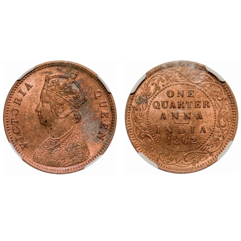 Victoria Queen, Copper, Quarter Anna, 1862, Madras Mint, A/I, No mint mark, No privy mark. F. Prid # 604. GK 399. NGC Slabbed MS 62 RB. Very Scarce.