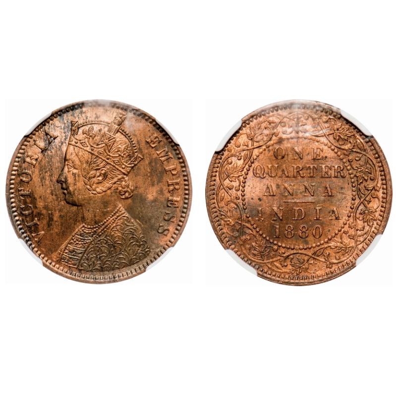 Victoria Empress, Copper, Quarter Anna, 1880, Calcutta Mint, B/II, No mint mark. F. Prid # Unlisted. GK 832. NGC Slabbed MS 63 RB. Scarce.