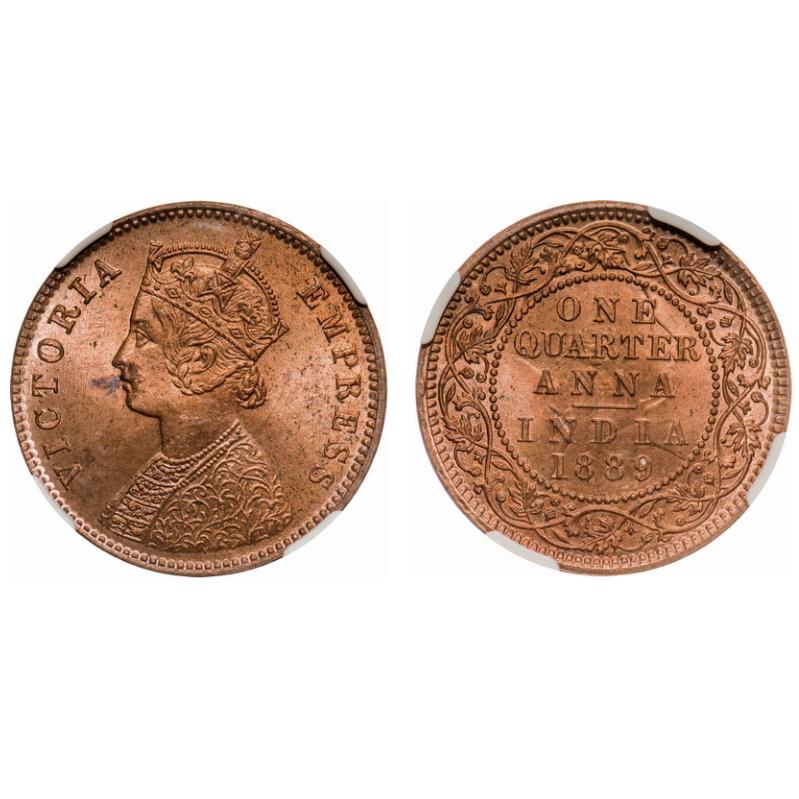 Victoria Empress, Copper, Quarter Anna, 1889, Calcutta Mint, B/II, No mint mark. F. Prid # 622. GK 848. NGC Slabbed MS 64 RB. Rare.