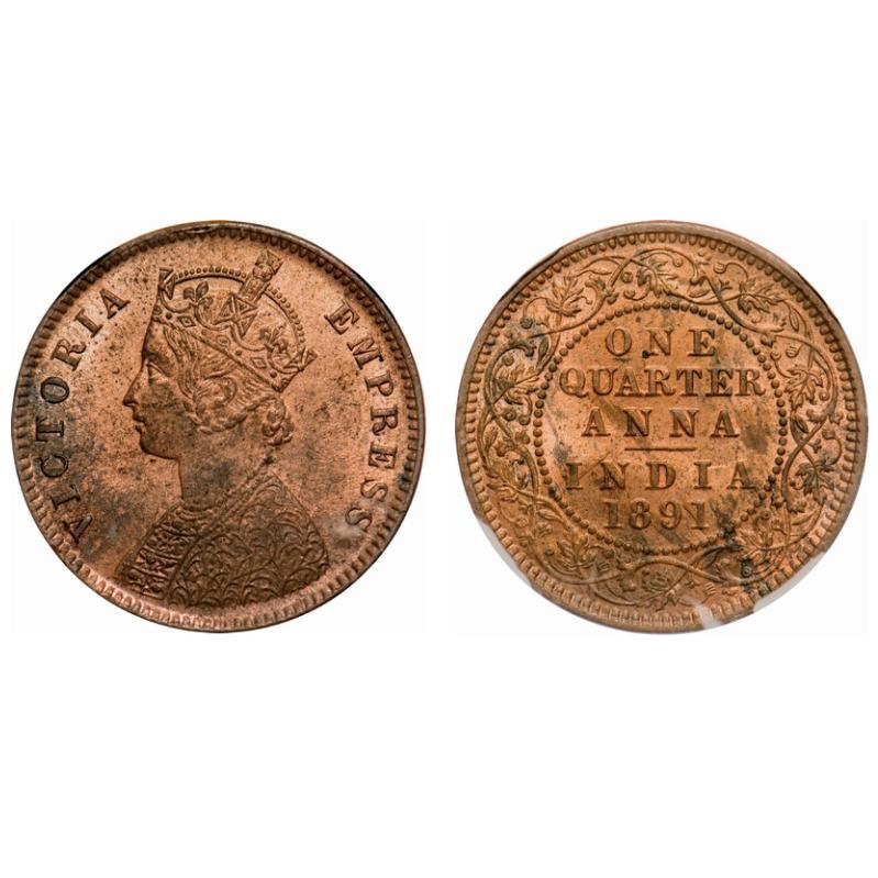 Victoria Empress, Copper, Quarter Anna, 1891, Calcutta Mint, B/II, No mint mark. F. Prid # 624. GK 850. NGS Slabbed MS 61+ BN. Scarce.