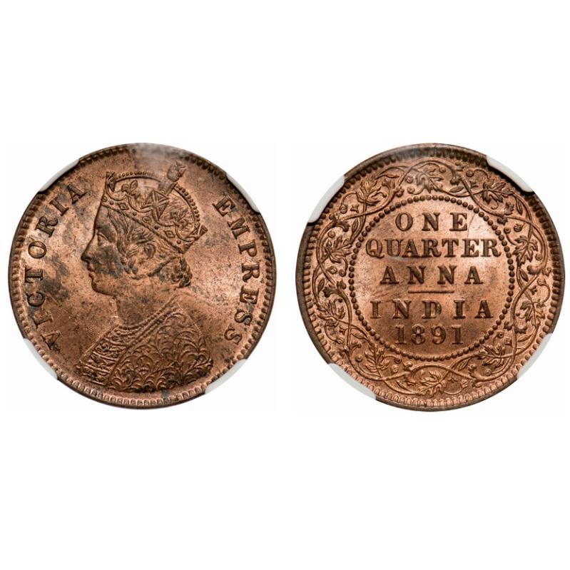 Victoria Empress, Copper, Quarter Anna, 1891, Calcutta Mint, B/II, No mint mark. F. Prid # 624. GK 850. NGC Slabbed MS 63 RB. Scarce.