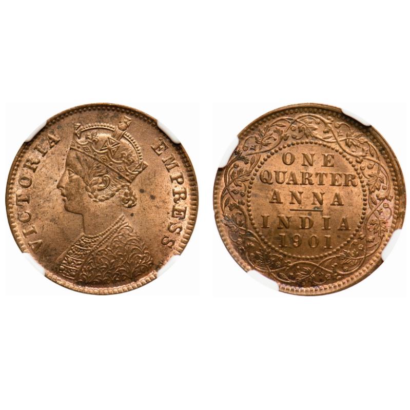 Victoria Empress, Copper, Quarter Anna, 1901, Calcutta Mint, B/II, No mint mark. F. Prid # 634. GK 860. NGC Slabbed MS 64 RB. Very Scarce.
