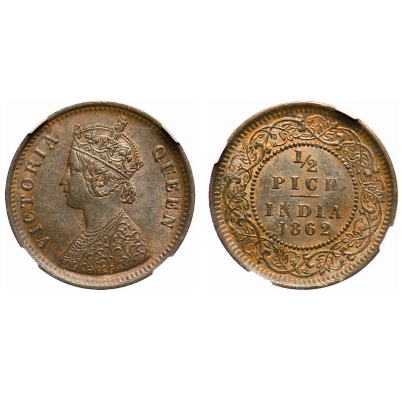 Victoria Queen, Copper, 1/2 Pice, 1862, Calcutta Mint, A/I. F. Prid # Unlisted. GK 401. NGC Slabbed MS 62 BN. Very scarce.