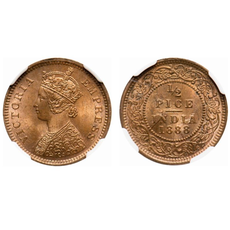 Victoria Empress, Copper, 1/2 Pice, 1888, Calcutta Mint, A/I, No mint mark. F. Prid # 720. GK 868. NGC Slabbed MS 64 RB. Extremely Rare.