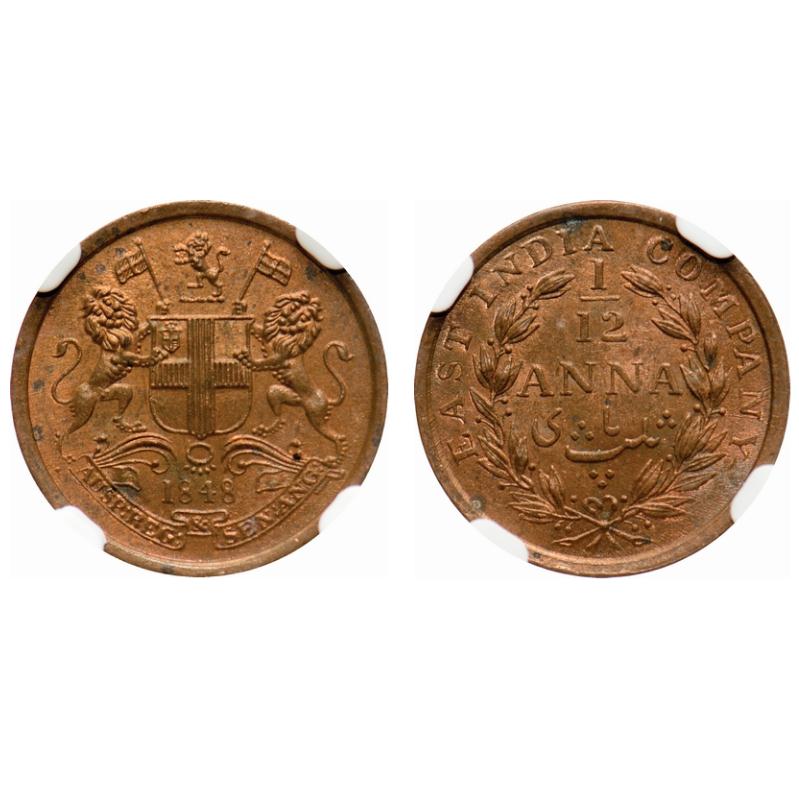 Victoria Queen, Copper, 1/12 Anna, 1848, Calcutta Mint, 23 Berries (13L + 10R), Rev aligned. F. Prid # 163. GK 237. NGC Slabbed MS 63 RB. Rare.