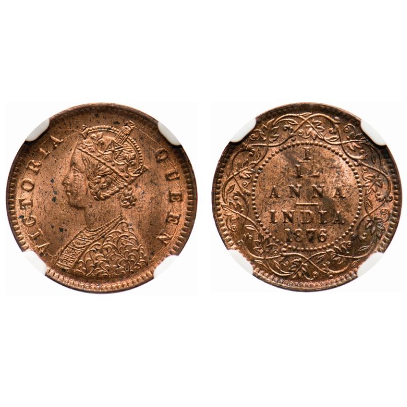Victoria Queen, Copper, 1/12 Anna, 1876, Calcutta Mint, Obv A, No mint mark. F. Prid # 785. GK 888. NGC Slabbed MS 63 RB. Very Rare.