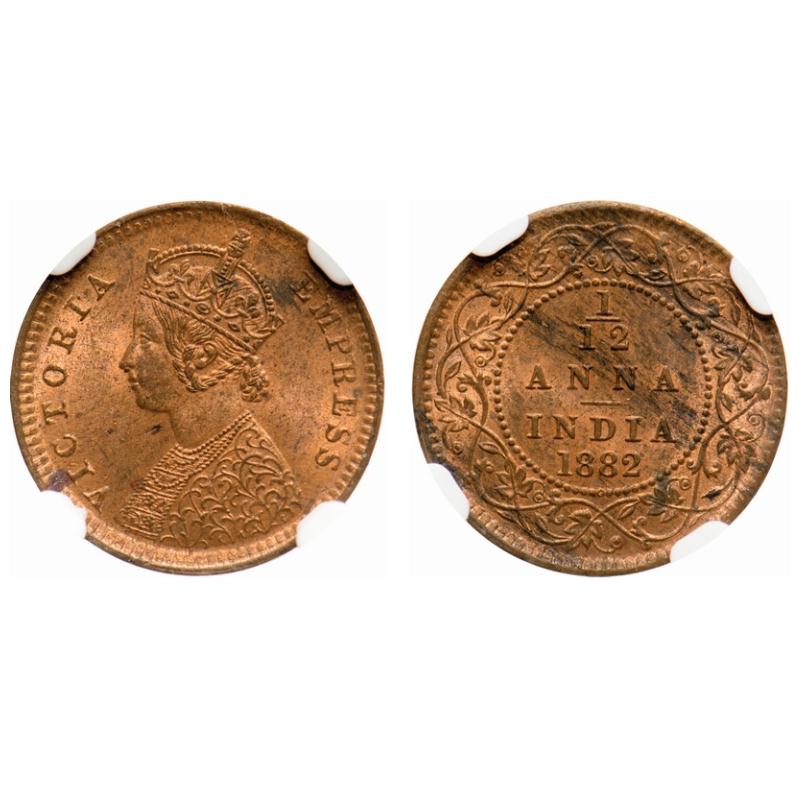Victoria Empress, Copper, 1/12 Anna, 1882, Calcutta Mint, Obv B, 'C' incused. F. Prid # 788. GK 893. NGC Slabbed MS 63 RB. Rare.