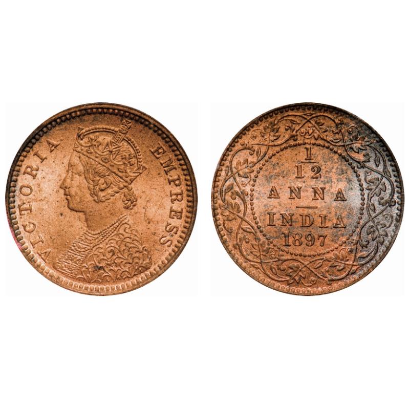 Victoria Empress, Copper, 1/12 Anna, 1897, Calcutta Mint, Obv B, No mint mark. F. Prid # 802. GK 918. NGS Slabbed MS 62+ BN Superb. Rare.