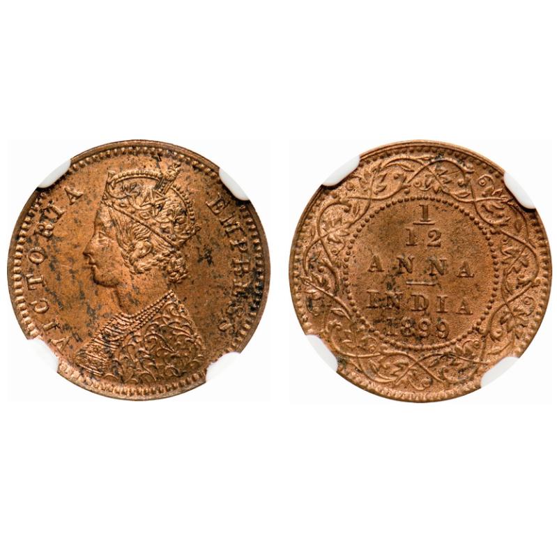 Victoria Empress, Copper, 1/12 Anna, 1899, Calcutta Mint, Obv B, No mint mark. F. Prid # 804. GK 920. NGC Slabbed MS 62 RB. Very Scarce.