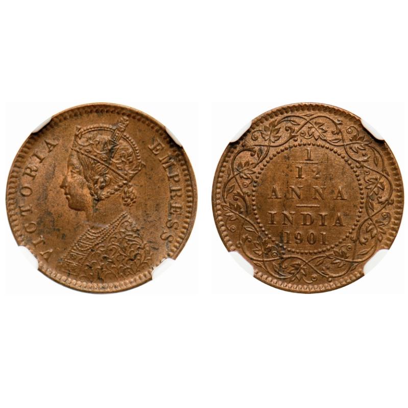 Victoria Empress, Copper, 1/12 Anna, 1901, Calcutta Mint, Obv B, No mint mark. F. Prid # 805. GK 921. NGC Slabbed MS 62 BN. Very Scarce.