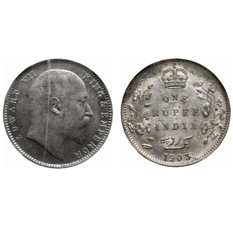 Edward VII, Silver, Rupee, 1903, Bombay Mint, 'B' incused, Dot. F. Prid # 199. GK 926. NGS Slabbed AU 55+, Toned. Very Scarce. ( Plastic slab has a crack on Obv)