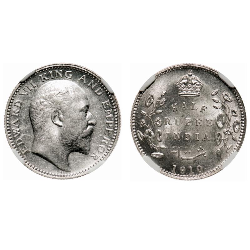 Edward VII, Silver, Half Rupee, 1910, Calcutta Mint, No mint mark. F. Prid # 314. GK 971. NGC Slabbed AU 58. Very Scarce.