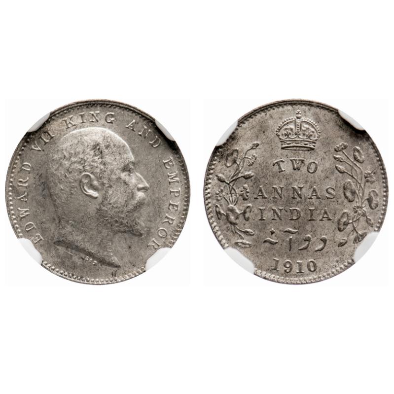 Edward VII, Silver, 2 Annas, 1910, Calcutta Mint, No mint mark. F. Prid # 563. GK 987. NGC Slabbed MS 64. Very Rare.