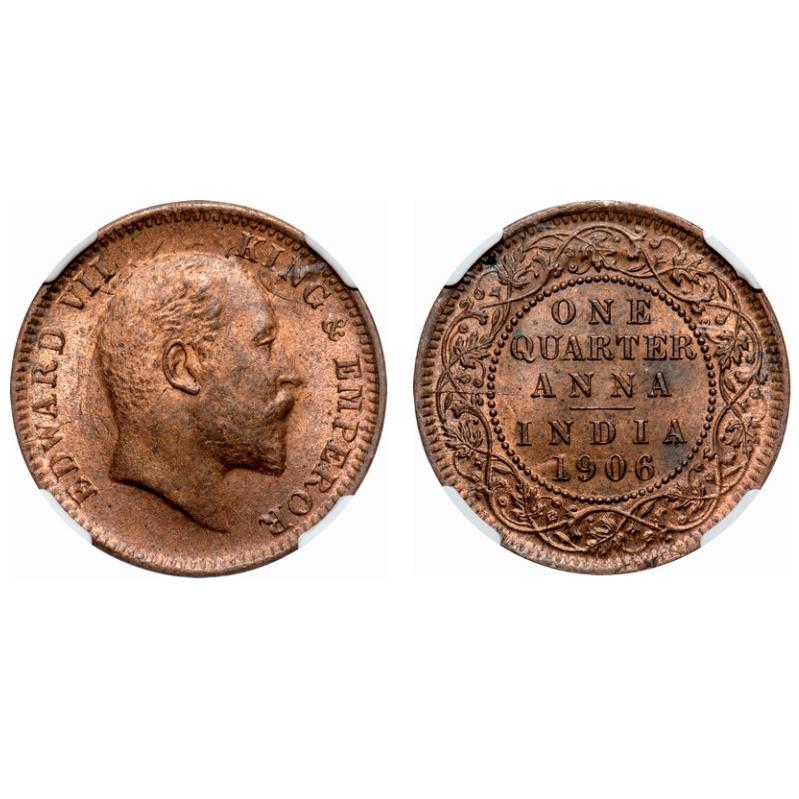 Edward VII, Copper, Quarter Anna, 1906, Calcutta Mint, no mint mark. F. Prid # 650. GK 997. NGC Slabbed MS 63 RB. Very Scarce.