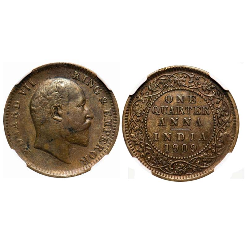 Edward VII, Bronze, Quarter Anna, 1909, Calcutta Mint, No mint mark. F. Prid # 654. GK 1001. NGC Slabbed XF 35 BN. Scarce.