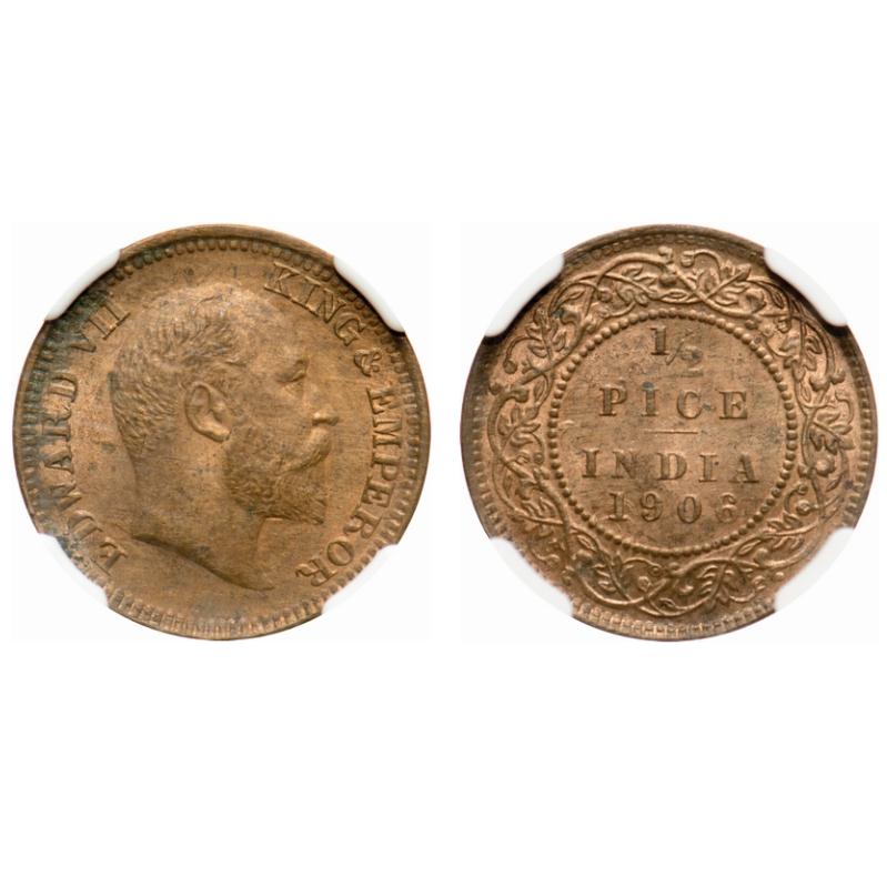 Edward VII, Bronze, 1/2 Pice, 1906, Calcutta Mint, No mint mark. F. Prid # 740. GK 1007. NGC Slabbed MS 61 RB. Very Rare.