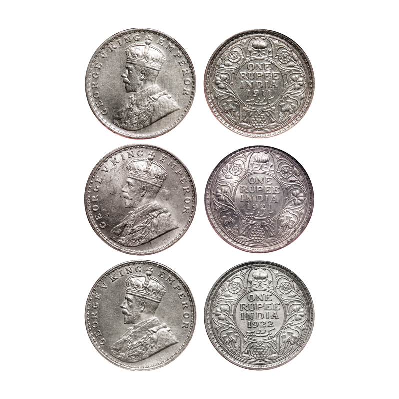 | George V, Silver, Rupee (3 slabs), 1911, 1921, 1922, Bombay Mint, Dot. F. Prid # 217, 227, 228. GK 1022, 1043, 1044. NGS Slabbed VF 35, AMS 50+, XF 45+. Scarce. |