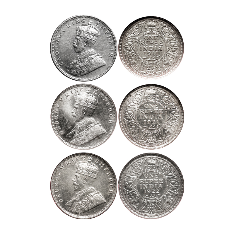 | George V, Silver, Rupee (3 slabs), 1911, 1921, 1922, Bombay Mint, Dot. F. Prid # 217, 227, 228. GK 1022, 1043, 1044. NGS Slabbed VF 35, AMS 55+, AMS 50. Scarce. |
