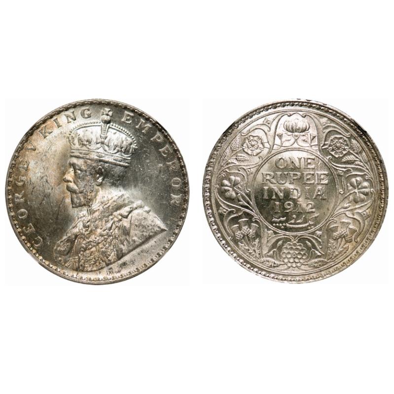 George V, Silver, Rupee, 1912, Calcutta Mint, No dot. F. Prid # 216. GK 1041. NGC Slabbed MS 63. Very Scarce.