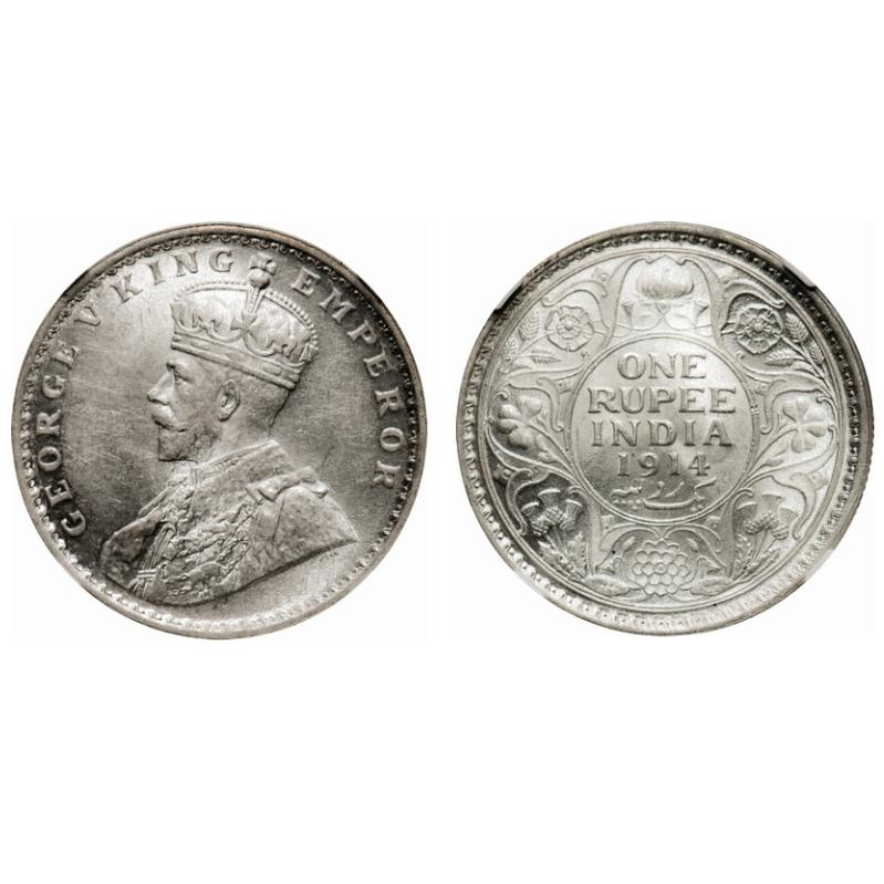 George V, Silver, Rupee, 1914, Calcutta Mint, No dot. F. Prid # 210. GK 1029. NGC Slabbed MS 61. Ra...