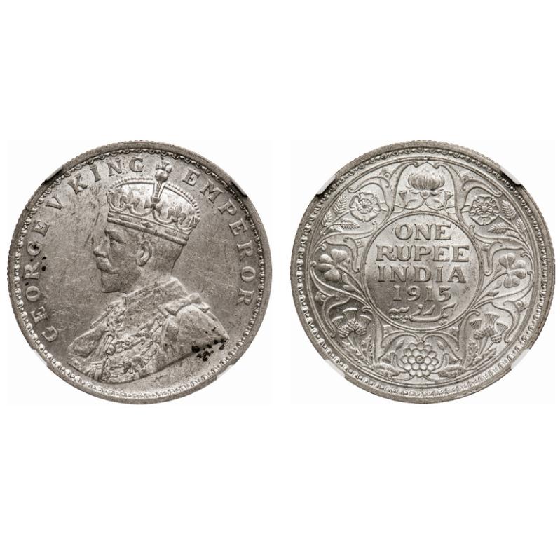 George V, Silver, Rupee, 1915, Calcutta Mint, No dot. F. Prid # 211. GK 1031. NGC Slabbed MS 61. Rare.