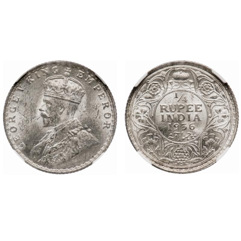 George V, Silver, 1/4 Rupee, 1936, Bombay Mint, Dot. F. Prid # 460. GK 1100. NGC Slabbed MS 62. Rare.