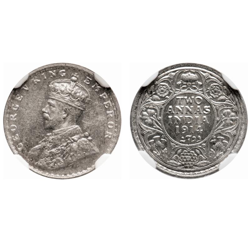 George V, Silver, 2 Annas, 1914, Bombay Mint, Dot. F. Prid # 573. GK 1113. NGC Slabbed MS 61. Rare.