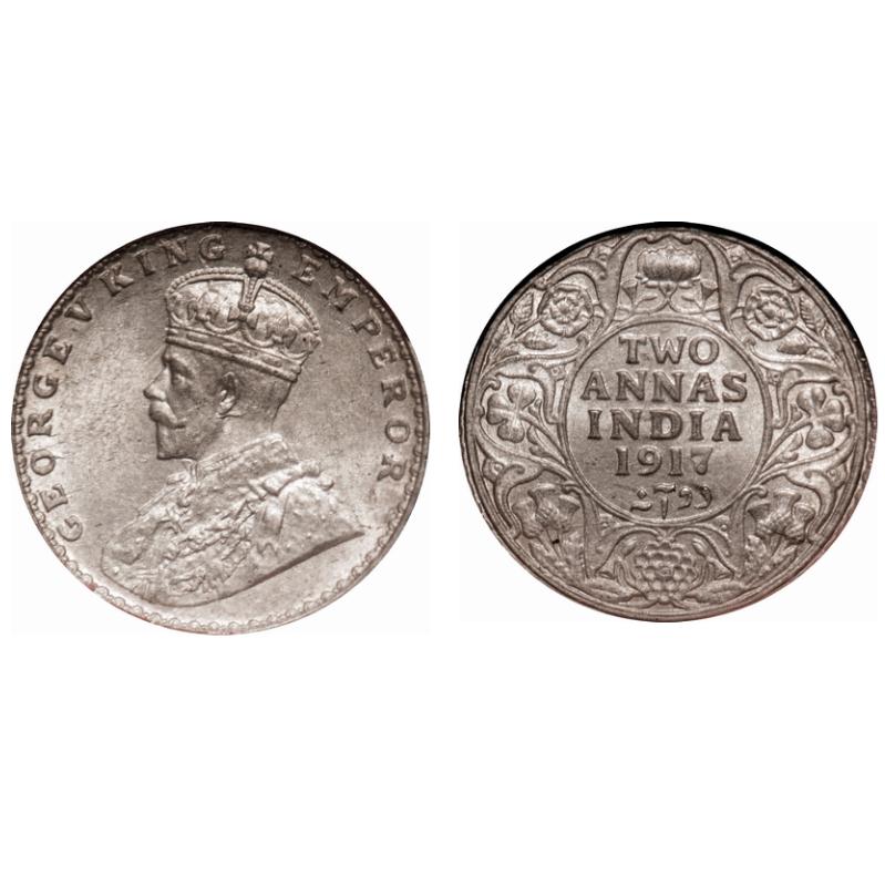 George V, Silver, 2 Annas, 1917, Calcutta Mint, No dot. F. Prid # 570. GK 1117. NGS Slabbed MS 63. Very Scarce.