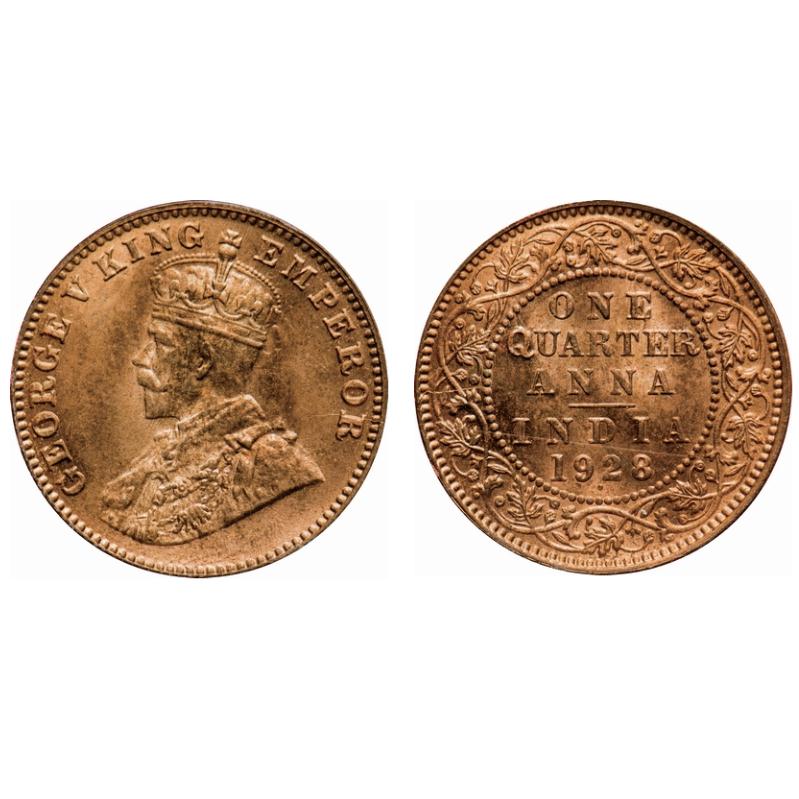 George V, Bronze, Quarter Anna, 1928, Calcutta Mint, No dot. F. Prid # 669. GK 1188. NGC Slabbed MS...
