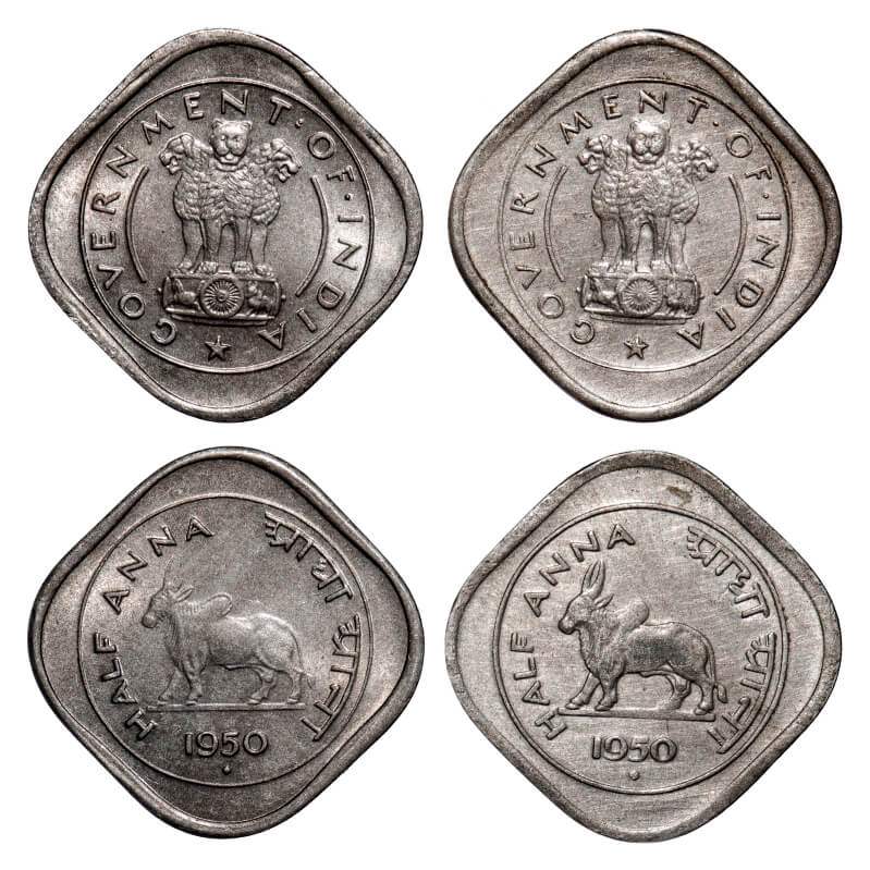 1/2 Anna (2 Coins), 1950, Nickel, Bombay Mint, Die Varieties, straight line above 'Aadha' and broken line above 'Aadha'. Uncirculated. Very Scarce.