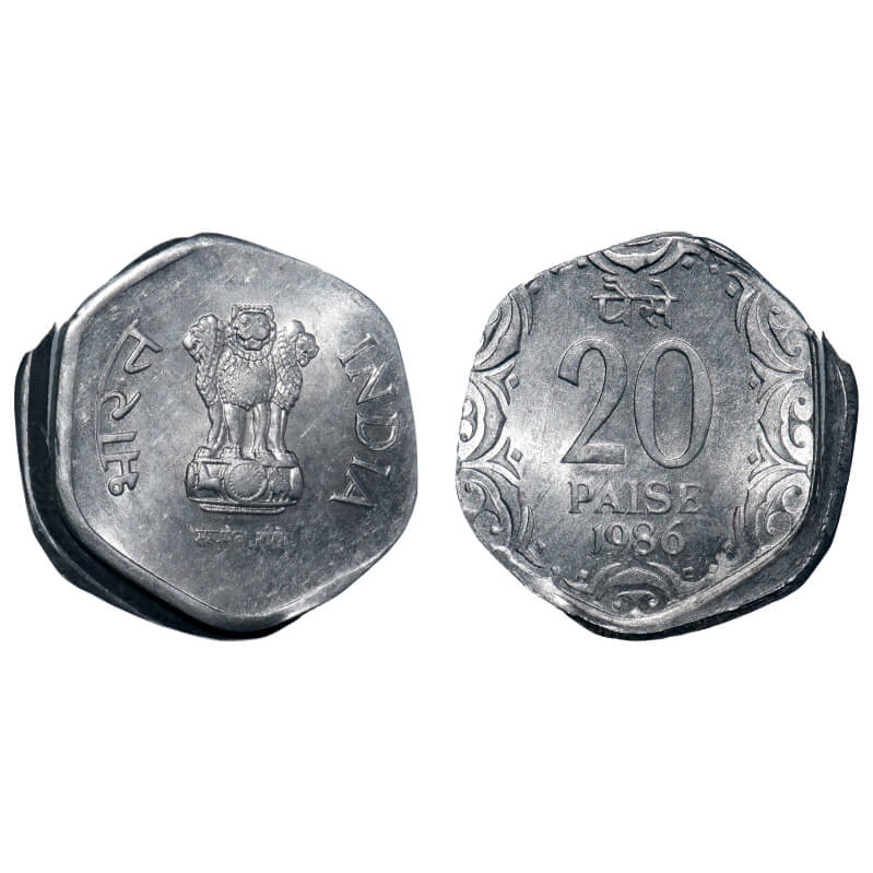 20 Paisa, 1986, Aluminium, 2.20g, 30% misaligned die. Uncirculated, Scarce.