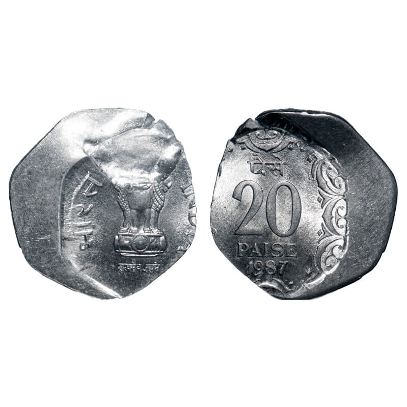 20 Paisa, 1985, Aluminium, 2.18g, Calcutta Mint, Indent error & double struck on both sides. Extremely Fine, Scarce.