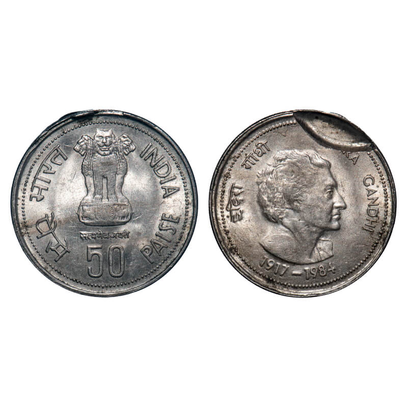 50 Paisa, 1984, Cu-Ni, 4.86g, Calcutta Mint, Indira Gandhi, Indent Error on obverse, About Uncirculated, Scarce.