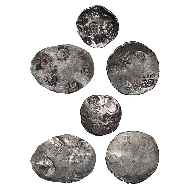 Archaic Coinage, Punch Marked, (3 Coins), attributed to Kashi Mahajanapada under Kosala Janapada (c. 525-465 BC), Varanasi Region (Uttar Pradesh), Silver Vimashatika, 4.86, 3.38, 3.05gm, Obv: Various symbols including whorl, star, pellets within square area and other geometric symbols, Rev: Banker marks. Very Fine, Scarce.