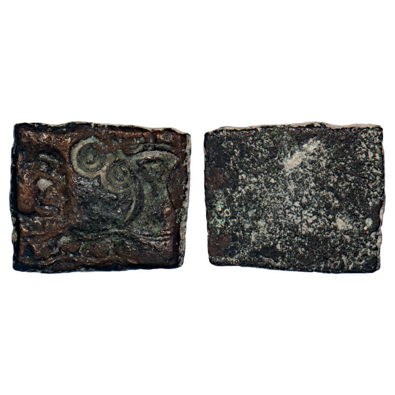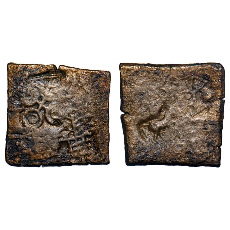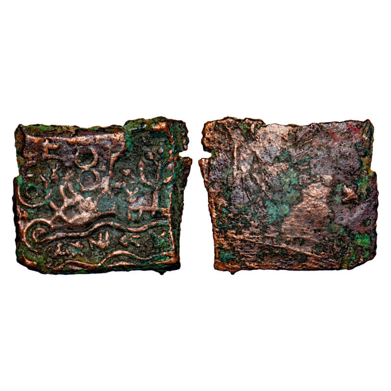 Post-Mauryan, Punch Marked, Vidisha Region, Uninscribed type, Copper Karshapana, 8.04gm, 23.36x23.58mm, Obv: Tree-in-railing, double orbed ujjaini and above indradhvaja symbol, Rev: Horse and indradhvaja symbol as a counter mark. Very Fine, Scarce.