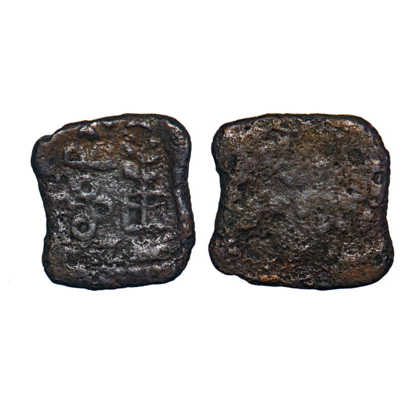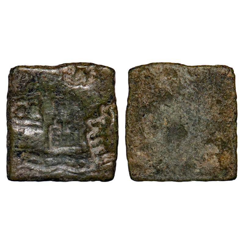 Post-Mauryan, Ujjaini Region, Uninscribed type, Copper Unit, 17.24x16.04mm, Obv: Four orbed ujjaini above three arched hill on left side and on right side three-in-railing, Rev: Blank. Unlisted in Pieper. Very Fine, Scarce.