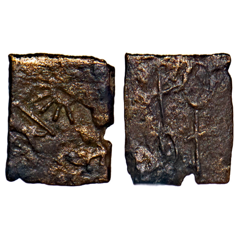 Late Mauryan, Vidarbha region, Cast Copper Karshapana, 11.43gm, 26.16x23.16mm, Obv: A three arched hill above crescent, Rev: Hollow cross, probably struck by the ministers of Ashoka in Vidarbha area of Pavani and Bhandara. Pieper # 374. Very Fine, details, Scarce.