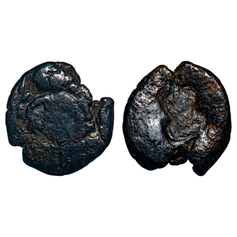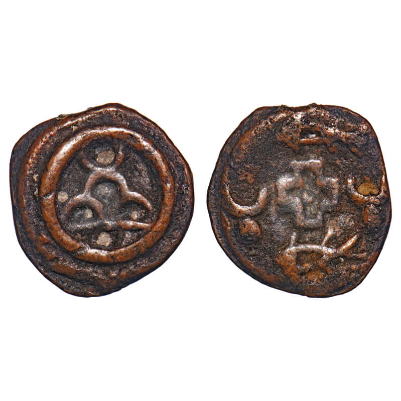 Post-Mauryan, Ujjaini Region, Copper Fraction, 0.87gm, 11.23x11.81mm, Obv: Seated Lakshmi holding lotus in her right hand and, Rev: Four orbed ujjaini symbol. Unlisted in Pieper. Very Fine, Scarce.