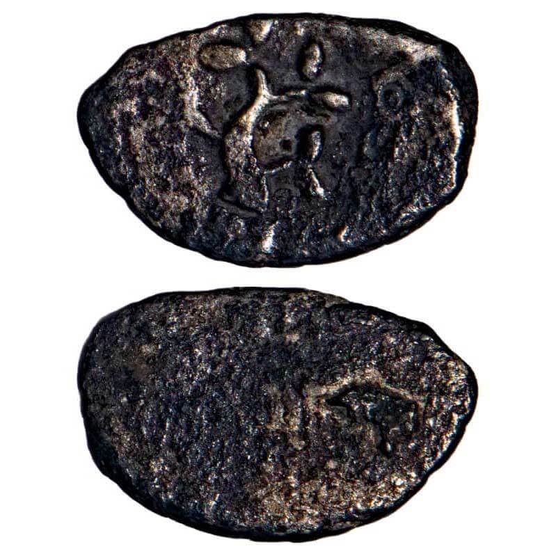 Post Mauryan, Vidisha region of central India (MP), 'Damru' type Uninscribed Copper punch-marked coin (c. 300 – 200 BC), 7.86gm, 20.62x17.35mm, Obv: Four punches - 'damru' (pellet-drum) shaped symbol, horse to right, river with fishes and turtles below, Ujjain symbol, Rev: Blank. Pieper # 466. About Very Fine, Scarce.