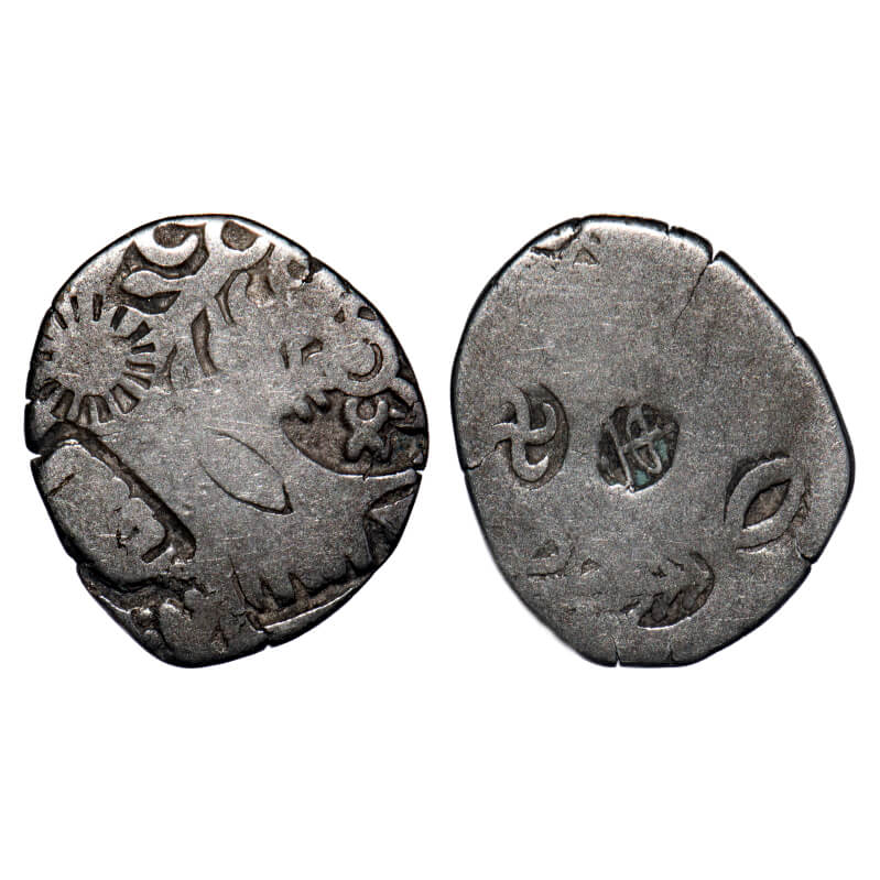 Archaic Punch Marked Coinage, Kosala Janapada (c. 500-400 BC), Silver Karshapana, 3.18gm, 15.30x15.13mm, Obv: Pointed star and other geometric symbols, Rev: Banker marks. Rajgor # Series 64. About Very Fine, Scarce.