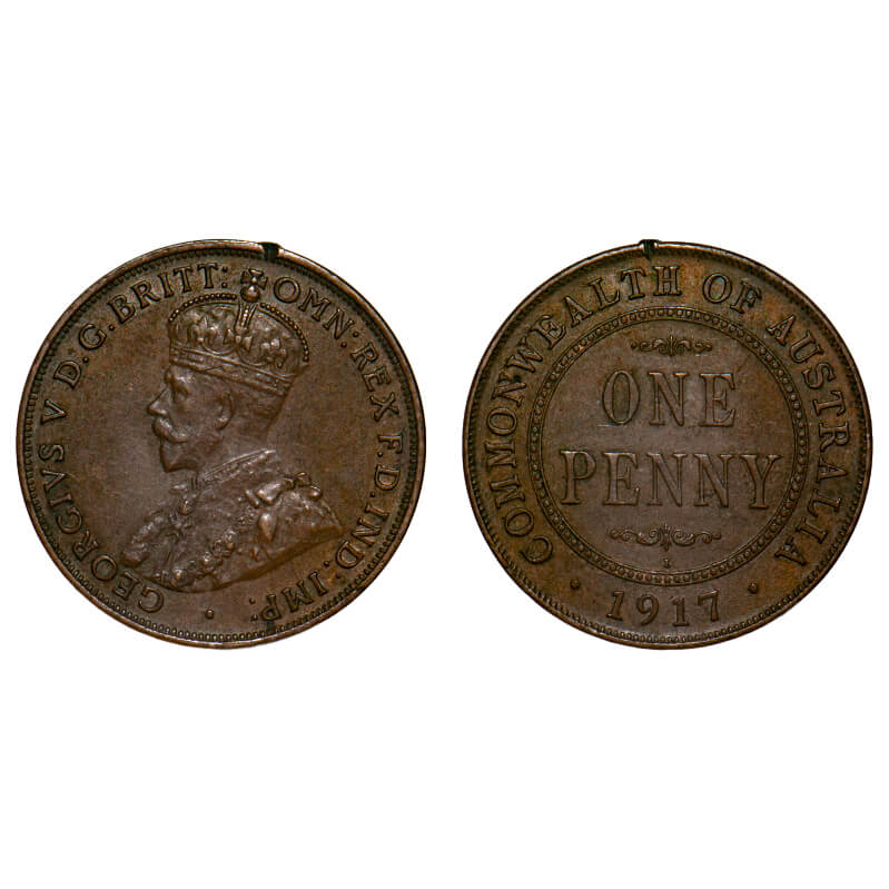 Australia, Copper, 1 Penny, 9.33g, 1917 AD, I Mint (Calcutta), George V. KM 23. edge knock, Very Fine+, Rare.
