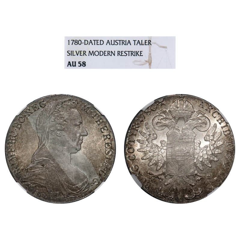 Austria, Silver Thaler (0.8330 silver), 28.06g, 1780 AD, Restrike Trade coinage, Gunzberg Mint, SF (Mint master Tobias Schobl & Ward J. Faby) Ruler Maria Theresa, Obv: Veiled bust right, M.THERESIA.DGR. IMP.GE.HU.BO.REG. Rev: Crowned arms BURG.CO.TYR 1780.X. ARCHID.AVST.DUX. KM T1. Note - Obv & Rev letterings with Re Engraved decorative strokes. KM T1. NGC graded AU 58, Scarce.