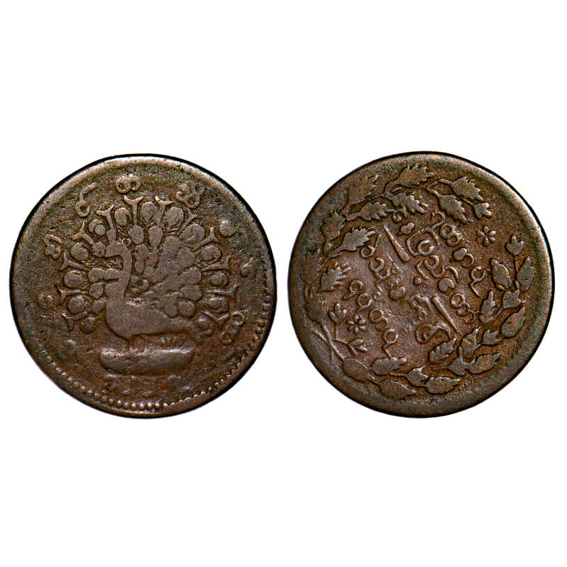 Burma, 1/4 Pe, Mindon ( CS 1214/1240/1853-1878 AD), CS 1227, Error reverse 2 o'clock. KM 17 Type, About Very Fine, Scarce.