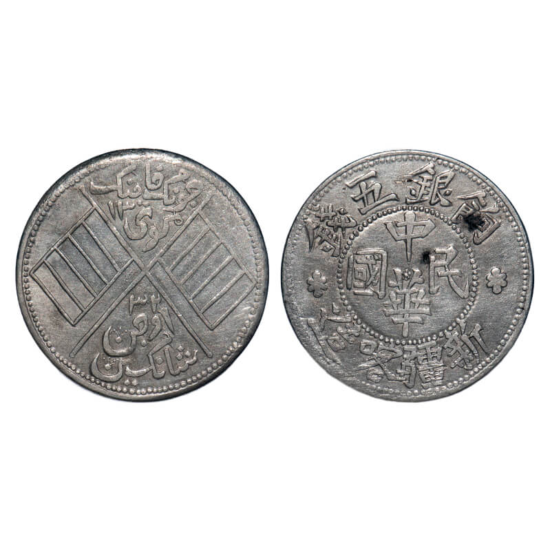 China (Sinkiang Province), Silver 5 Miscals, 17.78g, AH 1331, Obv: Four Chinese ideograms read top to bottom, right to left with Manchu characters in the centre, all surrounded by more Chinese ideograms. chinese script (5 Silver Qian, Republic of China, Made in Sinkiang), Rev: Two crossed flags with Arabic legend above and below. Arabic legends 5 MithqualKashgar mint. KM 43. Test marks. Very Fine, Details. Rare.