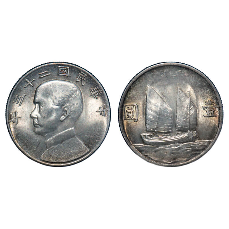 China, (0.8800 silver) Dollar (Yuan), 26.75g, Year 23 (1934 AD), Sun Yat Sen, Obv: Bust to left with 8 characters above, Rev: Junk (Boat) and rising sun, Denomination. Y # 345. Uncirculated, Rare.