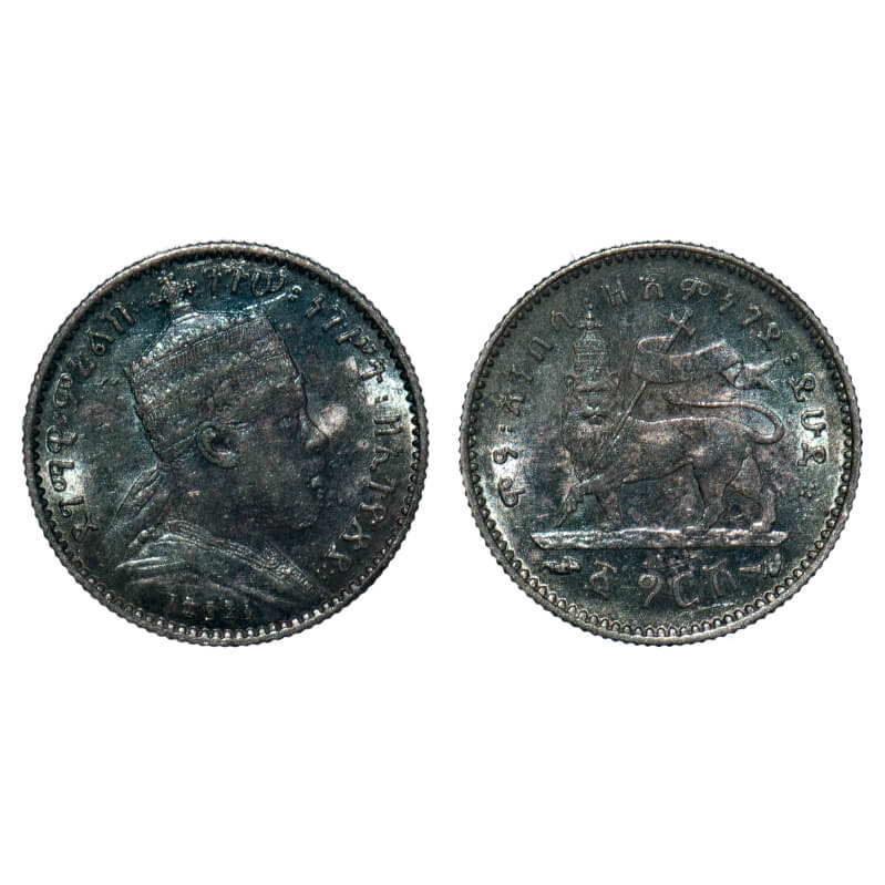 Ethopia, Silver Gersh, (0.835 silver), 1.44g, Menelik II, EE 1895 (1902-1903 AD), Obv: Emperor Menelik II Bust Facing Right, Rev: Lion of Judah: Crowned lion carrying a cross, right foreleg raised, KM 12. Toned Uncirculated, Scarce.
