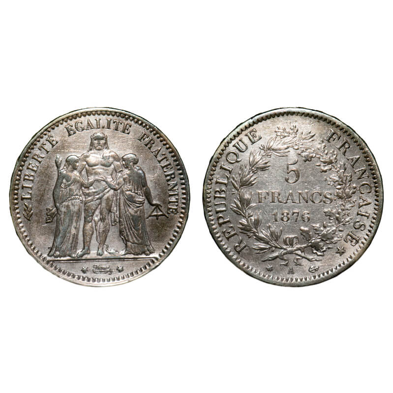 France, Silver 5 Francs (0.900 silver), 24.81g, 1876, W/o Mint Mark, Obv: Three figures standing, LIBERTE EGALITE FRATERNITE with below Dupre between stars, Rev: REPUBLIQUE FRANCAIS, Denomination & date, Edge: DIEU PROTEGE LA FRANCE. KM# 820.1. Extremely Fine, Scarce.