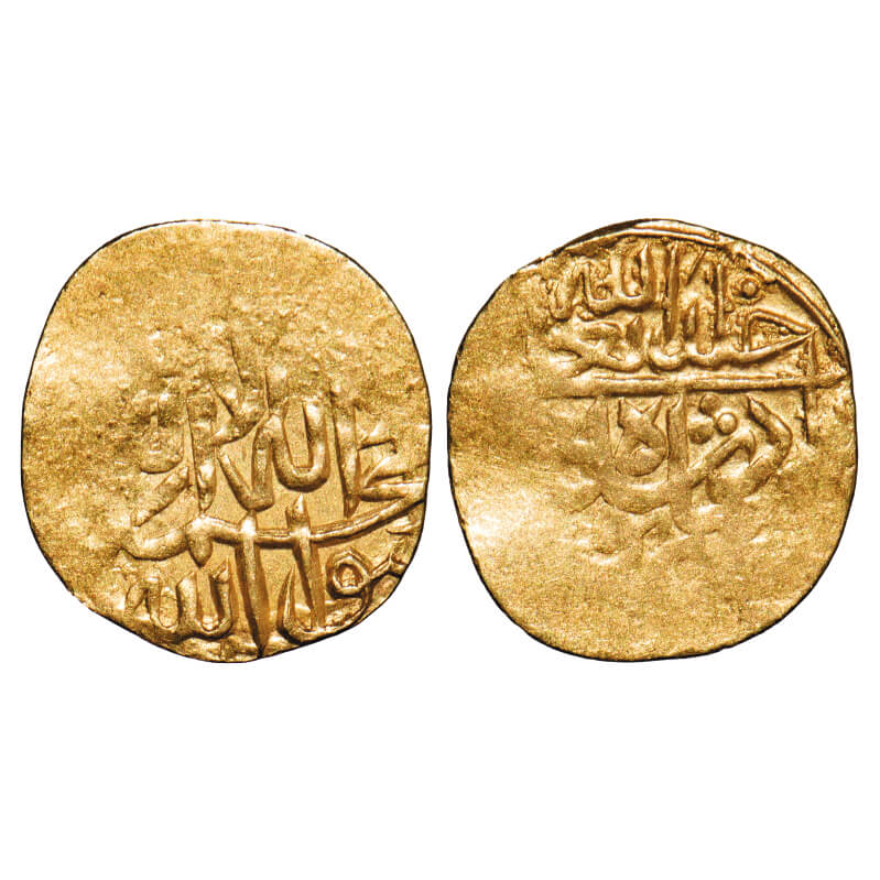 Humayun, Nasir al-Din Muhammad (AH 937-963 / 1530-1556 AD), Gold 1/8 Mithqal, 0.51g, mintless type but attributed to Badakhshan area, AH unseen, Kalima on obv., names and titles of the Emperor on rev. A 2464 type. About Very Fine, Type Rare.